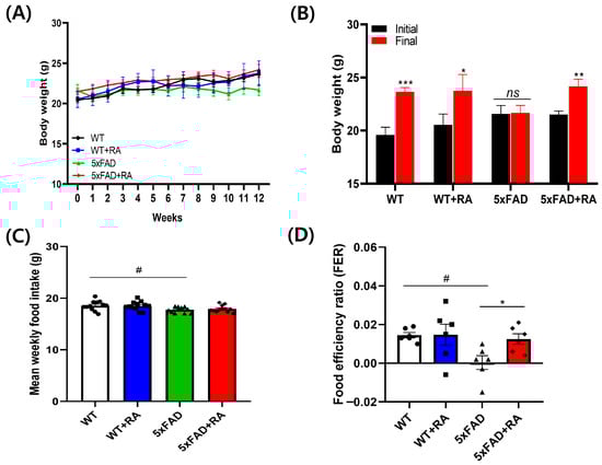 Three-month-old WT and WT+RA mice gained body weight, but not the 5xFAD mice during the 12-week experimental period. RA increased the weight gain in 5xFAD mice (Figure 2A,B). In 5xFAD mice, the average weekly food intake (Figure 2C) and FER was less than WT mice, but RA improved the FER in 5xFAD mice (Figure 2D).