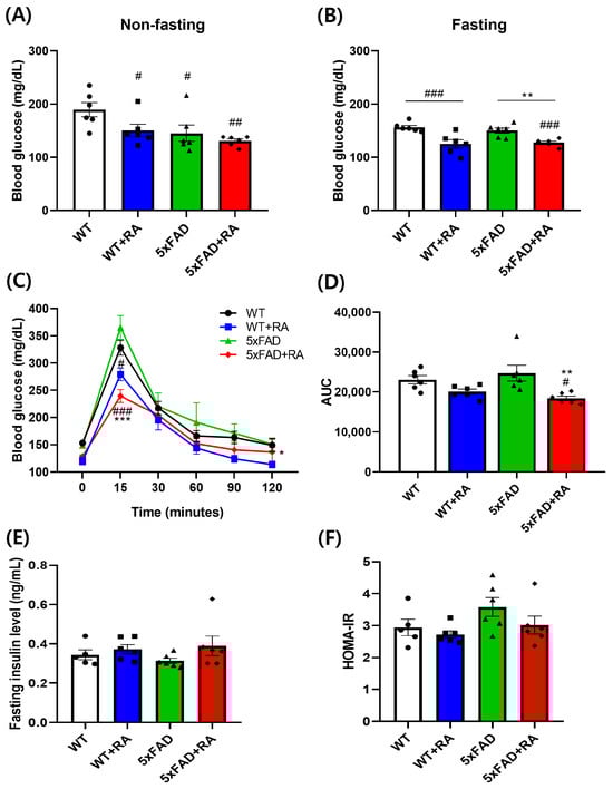 RA decreased the non-fasting and fasting blood glucose concentration in wild type mice and decreased the fasting blood glucose concentration of 5xFAD mice (Figure 3A,B). RA also reduced the peak blood glucose concentration in both wild type and 5xFAD mice, but the AUC was reduced only in 5xFAD mice by RA (Figure 3C,D). There was no significant change in the insulin levels and HOMA-IR among experimental groups (Figure 3E,F).