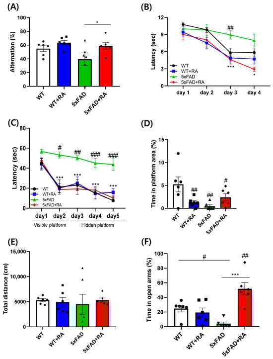 Percent alternation in the Y-maze as a measure of working memory was improved by RA in 5xFAD mice (Figure 4A). The latency to escape in the active avoidance paradigm was prolonged in 5xFAD mice and RA treatment normalized the lag of latency in 5xFAD mice (Figure 4B). As a measure of spatial learning and memory, latency to find the platform and the percentage spent in the platform area in the MWM test was also improved by RA in 5xFAD mice (Figure 4C,D). There was no significant difference in locomotor activity in the OFT (Figure 4E). 5xFAD mice showed anxiety-like response in the EPM and RA reduced anxiety-like behavior in both wild type and 5xFAD mice (Figure 4F).