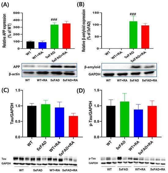 The expression of APP and β-amyloid increased in 5xFAD mice, but the expression of Tau and p-Tau remained unchanged in the hippocampus (Figure 5). RA treatment did not affect the amount of APP and β-amyloid accumulated in 5xFAD mice (Figure 5A,B). Also, RA did not affect the amount of Tau or p-Tau (Figure 5C,D).