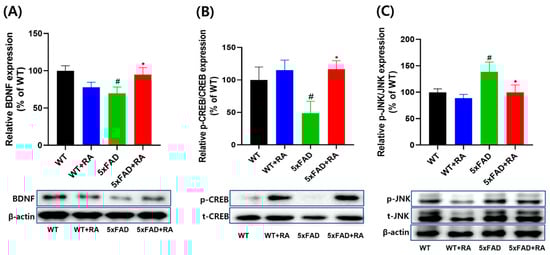 Effect of RA on hippocampal expression of neurotrophic signaling pathways in 5xFAD mice. (A) Normalized relative expression and representative image of BDNF. F(3, 20) = 3.3, p = 0.04. (B) Relative expression and representative image of p-CREB/CREB F(3, 20) = 3.5, p = 0.034. (C) Relative expression and representative image of p-JNK/JNK. F(3, 20) = 3.1, p = 0.049. All values are mean ± S.E.M. WT: DW fed in wild type females, WT + RA: RA 500 mg/kg fed in wild type females, 5xFAD: DW fed 5xFAD females, 5xFAD + RA: RA 500 mg/kg fed 5xFAD females. # p < 0.05 vs. WT, * p < 0.05 vs. 5xFAD. ANOVA and repeated measure ANOVA, LSD post hoc test.