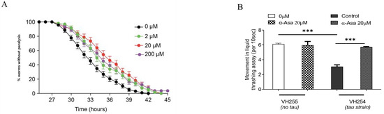 Synchronized VH255 (wildtype(wt) tau transgenic worms) and VH254 (pseudo hyperphosphorylated (PHP) tau transgenic worms) worms were cultured in 96 wells (15 worms per well in 110 μL of S-Complete/OP50 mixture) at 20 °C until they reached the L3 larval stage. Then, 25 μL of 1.08 mM FUDR was added to each well to inhibit egg-laying. After the worms developed to the adult stage, 15 μL of the α-asarone was added to each well until the Day 2 adult stage was reached; thrash frequency was recorded in 10 s using Wormlab® Imaging system from MBF Bioscience (Williston, VT, USA).