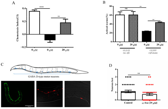 The neuroprotective effects of α-asarone in worms expressing Aβ in pan-neuron. (A) α-asarone improved chemotaxis in CL2355 nematodes. The CI is 0.18 ± 0.03 in the α-asarone group, and −0.08 ± 0.02 in the control group; there were at least 150 worms in total. Statistical analysis is shown in Table S3, error bars indicate SD, ** p < 0.01, **** p < 0.0001. (B) α-asarone enhanced 5-HT sensitivity in CL2355. The percentage of active worms is 43.38 ± 1.06%, there were at least 90 worms in total. Statistical analysis is shown in Table S4, error bars indicate SD, ** p < 0.01. (C) Representative images of the ventral nerve cord D-type neurons in EG1285 and PHX3692 nematodes. The upper image is the schematic drawing of the positions of the 19 GABA D-type motor neurons in C. elegans, the bottom left is a representative image of D-type motor neurons in the EG1285 animal which is the control strain of PHX3692 (ECHO Revolve Microscope, scale bar is 150 μm), bottom middle is a representative image of D-type neurons in PHX3692 (Leica SP8 Microscope, scale bar is 10 μm), bottom right is a representative image of worm-exhibited D-type neuron loss (Leica SP8 Microscope, scale bar is 10 μm). (D) α-asarone treatment reduced the number of worms that lost neurons in PHX3692 animals compared with the control group; there were at least 30 worms in total. Mean ± SD is shown, ** p < 0.01.