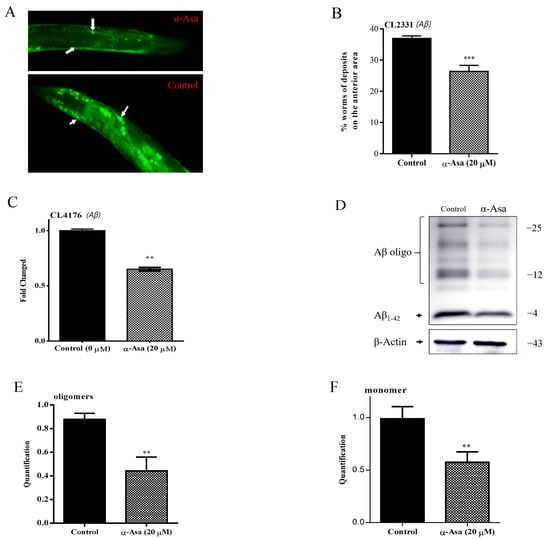 α-asarone decreased transcription and protein levels of Aβ in AD worms. (A) The representative fluorescence images in the anterior area in CL2331 worms, arrows indicate the accumulation of Aβ amyloid protein. (B) Statistics of the relative fluorescence intensity in the anterior area treated with 20 μΜ α-asarone or dmso control; the assays were tested three times., and there were 1000 worms in total. Fluorescence intensity analysis is shown in Table S5. (C) Aβ mRNA level in CL4176 worms treated with dmso control or α-asarone for 32 h after shifting the culture temperature to 23 °C; the assays were tested three times, and there were 1000 worms in total. (D) Aβ protein levels in CL4176 nematodes. The Western blotting assay was used to analyze the amount of Aβ monomers and oligomers, β-Actin is the internal reference. (E) Quantitative analysis of Aβ oligomers in each group. (F) Quantitative analysis of monomers in each group. The Error bar presents mean ± SD, ** p < 0.01; *** p < 0.001.