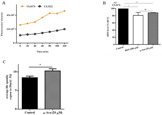 Synchronized CL4176 worms were treated with α-asarone (20 μΜ) or control. Worms were collected after culture at 23 °C for 32 h, then treated with 50 μM 2′,7′-Dichloro-fluorescein diacetate (H2DCF-DA; Molecular Probes (Waltham, MA, USA)), incubated at 37 °C for another 2 h to label the intracellular reactive oxygen species (ROS). Subsequently, quantification of fluorescence was measured in SpectraMax M5 Fluorescence Microplate Reader (Molecule Devices, San Jose, CA, USA), samples were read every 20 min for 2 h; the excitation was 485 nm, and the emission was 535 nm.