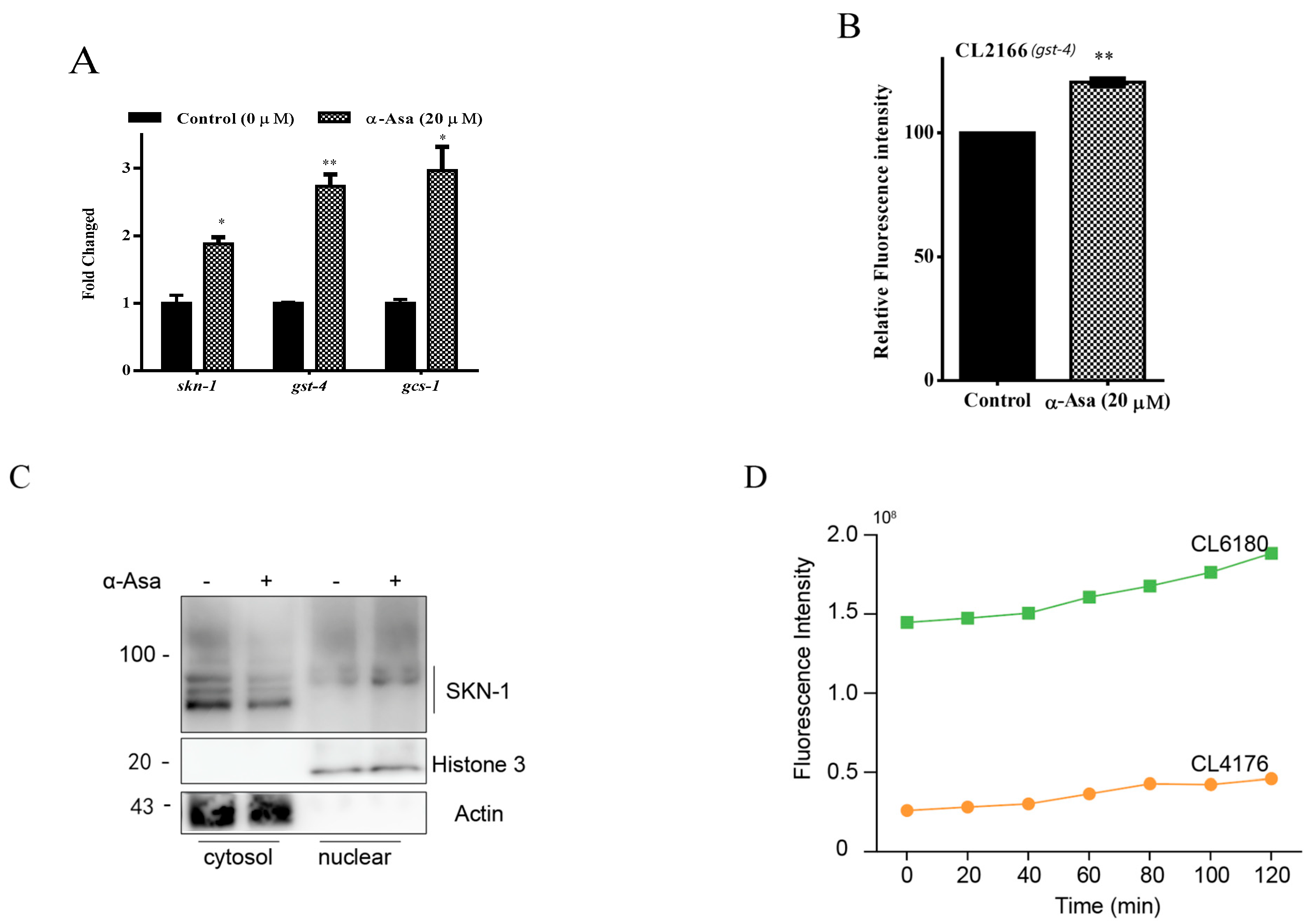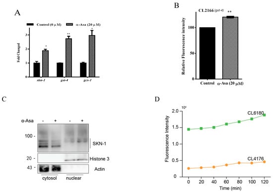Transcription factor SKN-1, a homolog of mammalian Nuclear Factor E2-Related Factors (Nrf2), is typically maintained at a low steady level due to rapid degradation by the ubiquitin–proteasome system (UPS) [28]. However, excessive oxidative stress and disruption of UPS result in SKN-1 stabilizing and translocating into the nucleus, where it binds to specific DNA regions (antioxidant response elements, AREs) to activate oxidative stress defense mechanisms [29]. Based on our findings (Figure 4B), we hypothesized that the protective properties of α-asarone are mediated through the SKN-1 pathway. To test this, we examined the transcription levels of skn-1 and its downstream target genes gst-4 and gcs-1. Our results showed that treatment with α-asarone significantly upregulated skn-1 and gst-4, gcs-1 mRNA levels (Figure 5A). Additionally, we also assessed GST-4 expression in CL2166 strains, which express GST-4 fused with GFP, and observed that α-asarone treatment increased GST-4 expression (Figure 5B, Table S8). Moreover, the immunoblotting results further confirmed that α-asarone treatment promoted SKN-1 translocation to the nucleus, indicating that α-asarone activates the SKN-1-mediated antioxidative pathway (Figure 5C).