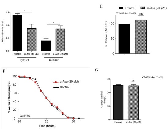 To elucidate the role of SKN-1 in the neuroprotective effects of α-asarone, we investigated its protective effects in an SKN-1 deficient background using the skn-1 mutant Aβ transgenic CL6180 strain. Compared to CL4176, SKN-1 deficient nematodes exhibit excessive ROS accumulation (Figure 5D). Notably, treatment with α-asarone failed to reduce the abnormally high ROS levels in CL6180 nematodes (Figure 5E). Similarly, α-asarone treatment did not mitigate Aβ-expression-induced paralysis in the skn-1 mutant CL6180 strain (Figure 5F,G, Table S9). All these results initially suggested that SKN-1 is a key regulator of the antioxidative and neuroprotective effects of α-asarone against Aβ-induced toxicity.