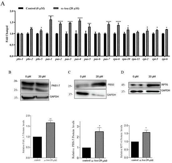 Given that α-asarone affected proteasome activity to protect against Aβ-induced injuries in C. elegans, we evaluated the expression levels of proteasomal subunits. QPCR results showed that α-asarone treatment significantly upregulated the transcription levels of genes encoding proteasomal α and β subunits, including pas-1,2,3,4,5,7 (which encode α-rings of 20S proteasome) as well as pbs-2, pbs-5 (which encode the β-rings of 20S proteasome). Additionally, α-asarone increased the mRNA levels of rpn-6, rpn-10, rpt-2, rpt-5 and rpt-6, which encode components of 19S regulatory subunits [33] (Figure 7A). Consistent with these mRNA expression results, α-asarone treatment significantly increased the protein levels of PAS1_7, PBS-5, and RPT-6 (Figure 7B–D).