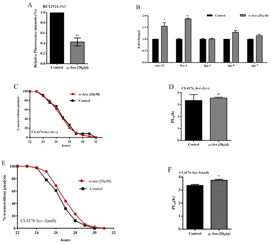 The protective effect of α-asarone against Aβ was related to the autophagy pathway. (A) The P62/SQST-1::GFP expression level in BC12921 strains. (B) α-Asarone upregulated the transcription levels of unc-51 (orthologous to human ulk-1 which participates in autophagy initiation), bec-1 (key gene to form the phagophore), atg-9, atg-7 (autophagosome formation-associated genes); more than 1000 worms in total. (C) α-Asarone did not affect the paralysis of nematodes when bec-1 was interfered compared with the control group. (D) Statistical analysis of PT50 in the bec-1 mutant strain. (E) Curves of worms not paralyzed that carry the empty plasmid control (bec-1 null) strain. (F) α-Asarone significantly prolonged the PT50 of nematodes in CL4176 bec-1-null strain. Each treatment has at least 30 worms, 3 biology replicates for each experiment; difference between mean is shown as mean ± SD, unpaired t-test, ns p > 0.05, * p < 0.05, ** p < 0.01. The statistical data is shown in Table S10.