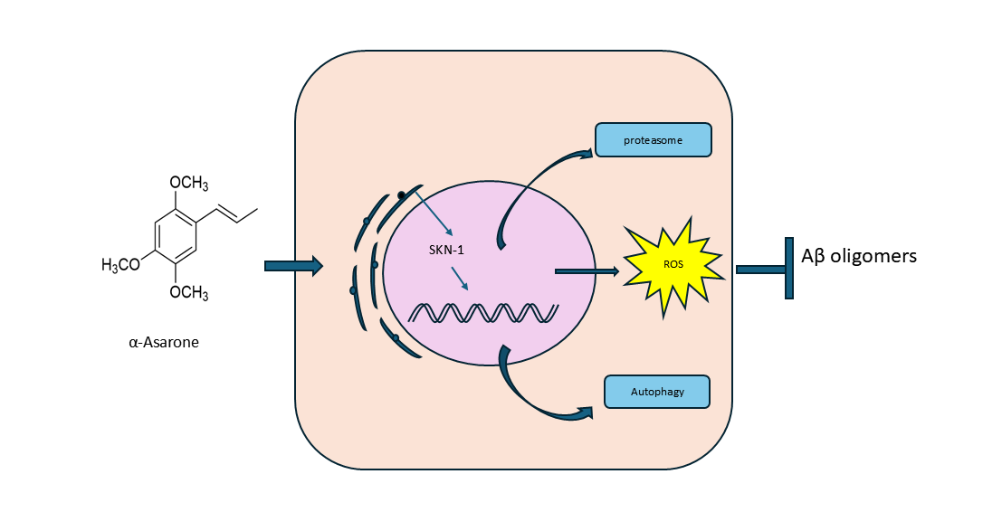In addition, tau pathology-related neuroinflammation has been closely linked to cognitive dysfunction, and targeting tau has raised as a potential alternative therapeutic strategy for AD [46]. In this study, we observed that α-asarone treatment significantly reduced hyperphosphorylated-tau-induced AD progression, suggesting a potential effect of α-asarone on tau pathology. We hypothesize that α-asarone may ameliorate hyperphosphorylated tau-induced phenotypes through its proteostasis-regulating activity, and further studies are worthwhile to dissect the underlying mechanism. Current Alzheimer’s disease therapeutics primarily offer symptomatic relief by targeting cholinergic and glutamatergic neurotransmission. Despite more than 2700 AD clinical trials conducted over the past two decades, most have failed to yield satisfactory outcomes [47]. The mystery of AD pathophysiology hindered the development of disease-modifying drugs. Given the failure of the single target approach, polypharmacology to maintain protein homeostasis may pave new avenues for AD. Nrf2 is a master regulator in cellular health, influencing various processes, including antioxidative stress, and protein degradation, making it a potential target for neurodegenerative disease treatment. Our results demonstrated that α-asarone mitigates Aβ-induced toxicity in C. elegans through SKN-1-mediated proteostasis, implying its therapeutic potential as an Nrf2 activator for AD treatment. However, we did not investigate the protective effect of α-asarone in other AD models, and more investigations should be performed to validate its function in the future.