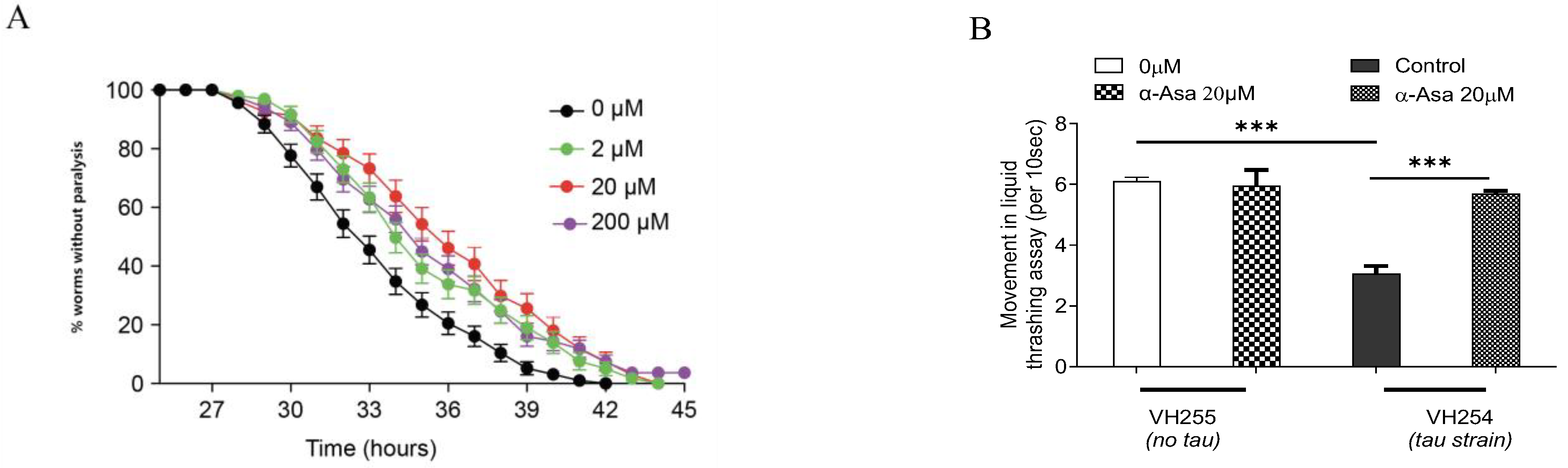 Figure 1. Effects of α-Asarone on Aβ-induced paralysis and tau-induced damage in nematodes. (A) α-Asarone delayed Aβ-induced paralysis in CL4176. The assays were tested three times, and there were at least 30 worms for each assay. Statistical analysis is shown in Table S1. (B) Liquid thrashing assay in tau transgenic worms. VH255 is the control strain for VH254 which expresses pseudohyperphosphorylated (PHP) tau; the thrashing rate of each worm for 10 s was recorded in liquid, the assays were tested three times., and there were 30 worms for each assay. Statistical analysis is shown in Table S2. The error bar presents mean ± SD, “***” represents p value < 0.001.
