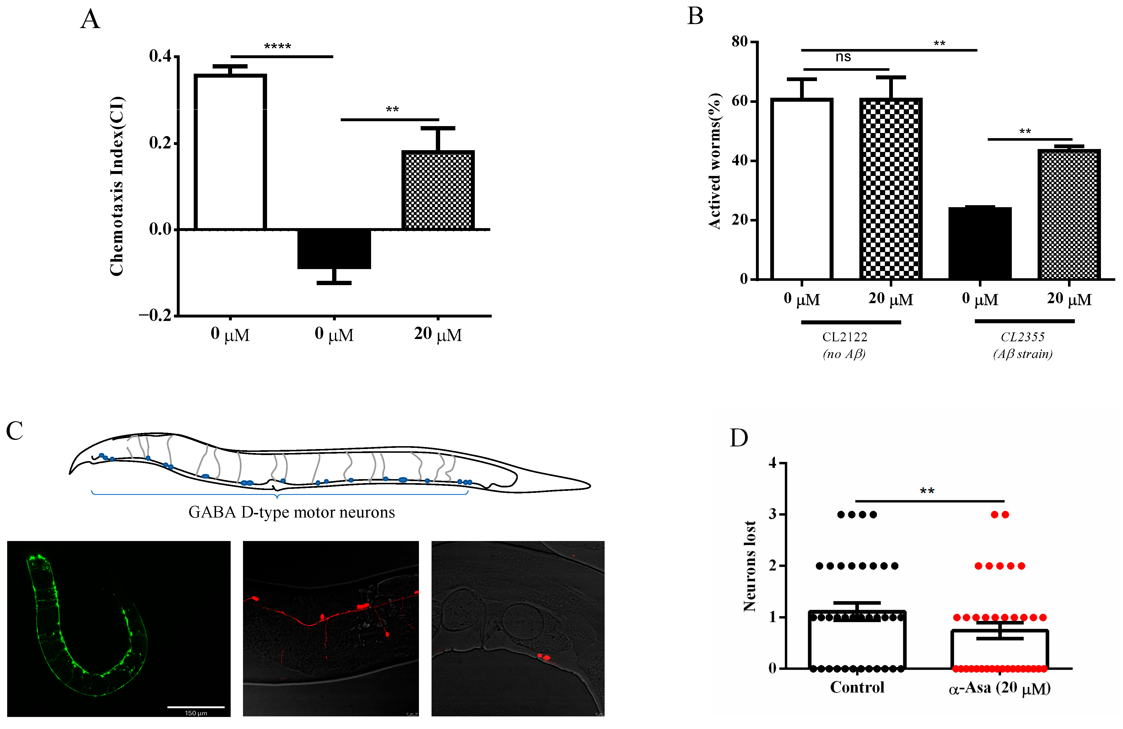 Figure 2. The neuroprotective effects of α-asarone in worms expressing Aβ in pan-neuron. (A) α-asarone improved chemotaxis in CL2355 nematodes. The CI is 0.18 ± 0.03 in the α-asarone group, and −0.08 ± 0.02 in the control group; there were at least 150 worms in total. Statistical analysis is shown in Table S3, error bars indicate SD, ** p < 0.01, **** p < 0.0001. (B) α-asarone enhanced 5-HT sensitivity in CL2355. The percentage of active worms is 43.38 ± 1.06%, there were at least 90 worms in total. Statistical analysis is shown in Table S4, error bars indicate SD, ** p < 0.01. (C) Representative images of the ventral nerve cord D-type neurons in EG1285 and PHX3692 nematodes. The upper image is the schematic drawing of the positions of the 19 GABA D-type motor neurons in C. elegans, the bottom left is a representative image of D-type motor neurons in the EG1285 animal which is the control strain of PHX3692 (ECHO Revolve Microscope, scale bar is 150 μm), bottom middle is a representative image of D-type neurons in PHX3692 (Leica SP8 Microscope, scale bar is 10 μm), bottom right is a representative image of worm-exhibited D-type neuron loss (Leica SP8 Microscope, scale bar is 10 μm). (D) α-asarone treatment reduced the number of worms that lost neurons in PHX3692 animals compared with the control group; there were at least 30 worms in total. Mean ± SD is shown, ** p < 0.01.