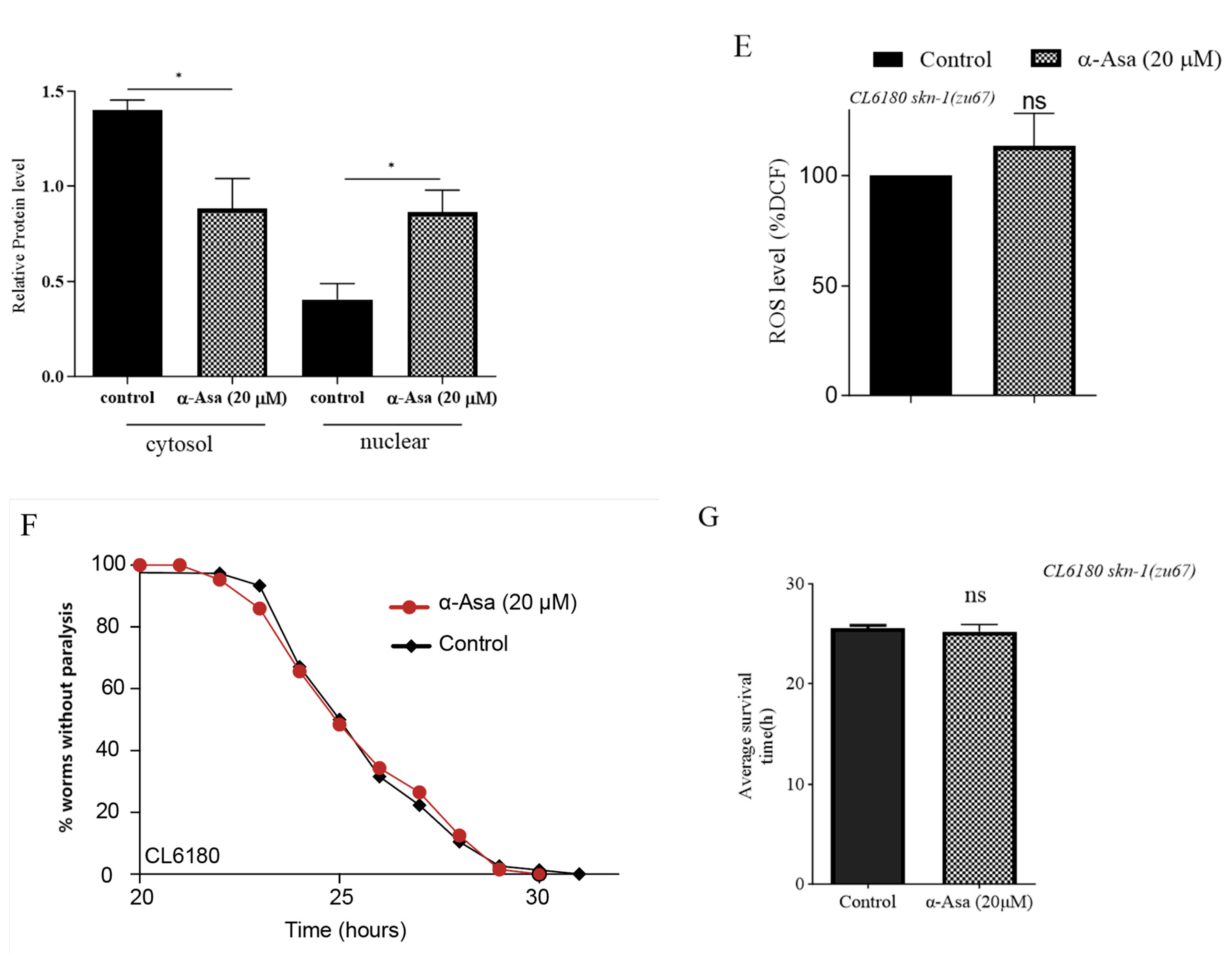 Figure 5. α-asarone mediated neuroprotection requires the regulation of SKN-1. (A) The transcription levels of skn-1 and its target genes in CL4176 nematodes; the assays were tested three times, and there were 1000 worms in total. (B) The relative fluorescence intensity of GST-4 in the CL2166([(pAF15) gst-4p::GFP::NLS] III) strain was quantified by ImageJ; there were 90 worms in total. Detailed data is shown in Table S8. (C) Western blotting analysis of cytosol and nuclear Nrf2 protein levels in CL4176 nematodes; the assays were tested three times, and there were 1000 worms in total. (D) The ROS accumulation levels in CL4176 and CL6180 nematodes (more than 60 worms in total). (E) The ROS levels of CL6180 worms after being fed with α-asarone and DMSO control. There is no significant difference between the α-asarone group and the control group; the assays were tested three times., and there were 30 worms for each assay. Analysis data is presented in Table S9. (F) Curves of worms not paralyzed in the CL6180 mutant strain. (G) The average lifetime of CL6180 in the α-asarone and control group (more than 60 worms in total). Value is presented as mean ± SEM, ns p > 0.05, * p < 0.05, ** p < 0.01.