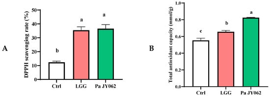 The antioxidant capacity of postbiotic Pa JY062 (n = 3 biological replicates). (A) The DPPH scavenging rate (%) of postbiotic Pa JY062. (B) The total antioxidant capacity of postbiotic Pa JY062. The different letters indicate statistically significant differences (p < 0.05).