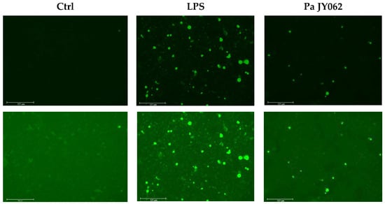 To investigate the protective effect of Pa JY062 against oxidative stress, intracellular ROS levels in Caco-2 cells were assessed by fluorescence imaging. The LPS resulted in a significant increase in green fluorescence in Caco-2 cells compared to the Ctrl. Pa JY062 markedly reduced the green fluorescence relative to LPS (Figure 2, p < 0.001).