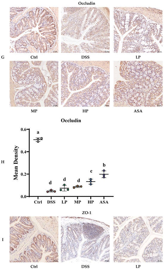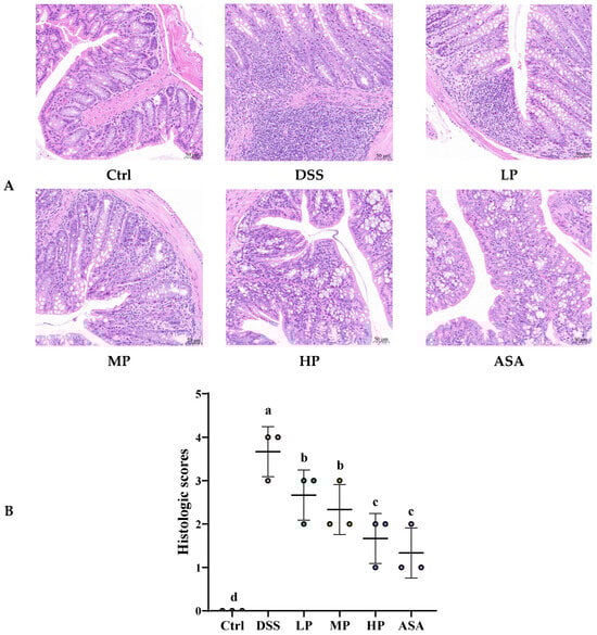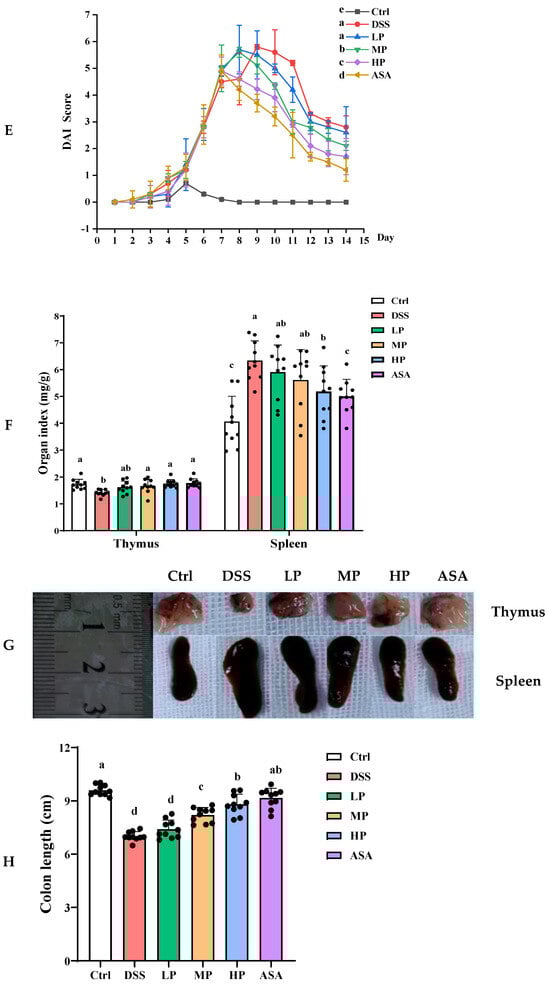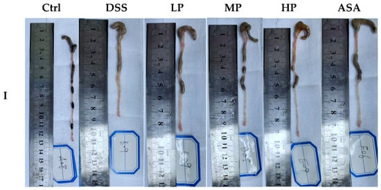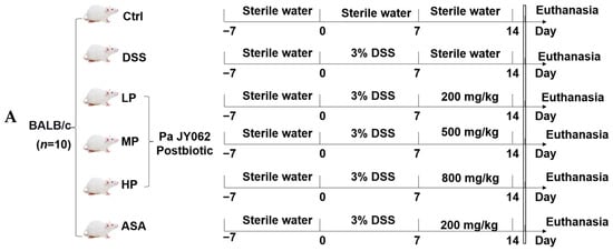 The animal experimentation protocol received approval from the Animal Ethics Committee of Northeast Agricultural University to ensure the utmost adherence to animal welfare, with the experiment designated as NEAUEC20230422, approval on 9 November, 2023. Sixty 8-week-old male BALB/c mice (weight: 20 ± 2 g) were acquired from Chengdu Dossy Experimental Animals Co., Ltd. (Chengdu, China). All mice were randomly divided into 6 groups (n = 10): control group (Ctrl, sterile water), DSS group (DSS, 3% DSS solution), 5-aminosalicylic acid group (ASA, 200 mg/kg), low-dose Pa JY062 (LP, 3.0% DSS + 200 mg/kg Pa JY062), medium-dose Pa JY062 (MP, 3.0% DSS + 500 mg/kg Pa JY062), and high-dose Pa JY062 (HP, 3.0% DSS + 800 mg/kg Pa JY062).