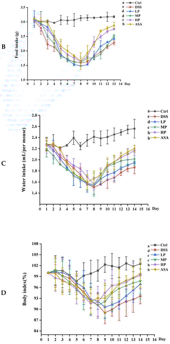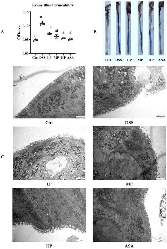 Mice were acclimatized for 7 days under standard conditions: temperature of 23 ± 2 °C, relative humidity of 55 ± 10%, and a 12 h light/dark cycle. Then, all groups, except for the Ctrl group, were granted unrestricted access to 3% DSS to establish a model of colitis (day 0 to day 7). During the remission period (day 8 to day 14), Ctrl and DSS groups received 200 μL of sterile water daily. LP, MP, and HP groups were given daily 200 μL of Pa JY062 solutions. The ASA group was gavaged daily with 200 μL of a 5-ASA solution. The daily food intake, water intake, and body weight changes in all mice were recorded. Fecal samples from each mouse were collected daily into a 1.5 mL sterile centrifuge tube. On day 15, all mice were humanely euthanized under intraperitoneal anesthesia with 10% chloral hydrate. The length of the colon was assessed, and the spleen and thymus were subjected to weighing. Three mice from each group were selected to assess Evans blue colonic permeability. One segment of the fresh colon was frozen at −80 °C, another segment was preserved in 2.5% glutaraldehyde, and the final segment was fixed in 4% paraformaldehyde for subsequent analyses. The spleen, thymus, serum, and cecal contents were harvested and preserved at −80 °C.