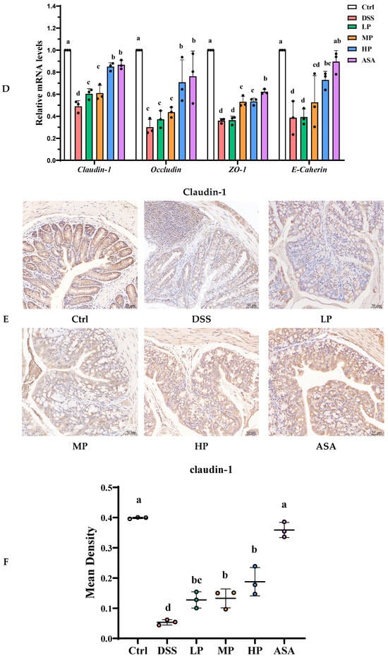 The integrity of the intestinal barrier is regulated by multiple factors. Therefore, we analyzed the protective effect of Pa JY062 on 3% DSS-induced colonic barrier damage from multiple perspectives, including Evans blue permeability, microstructure, expression of barrier regulatory proteins, and oxidative stress. Compared with the Ctrl group, the Evans blue permeability of the DSS group increased significantly (DSS: 0.1073 ± 0.005 vs. Ctrl: 0.048 ± 0.003, p < 0.01, Figure 5A,B). TEM revealed that the structural integrity of the intestinal barrier junctions was compromised, accompanied by a loss of the brush border (Figure 5C). RT-qPCR exhibited the expression of barrier junction proteins (ZO-1, Occludin, Claudin-1 and E-cadherin) decreased (Figure 5D). Immunohistochemistry (IHC) analyses further demonstrated that the Ctrl group exhibited the strongest positive staining (brown-yellow) for ZO-1, Occludin, and Claudin-1, whereas the DSS group showed a substantial reduction in the expression of these proteins (Figure 5E–J). Meanwhile, the number of goblet cells decreased (Figure 5K), and the enzyme activities of GSH-Px (DSS: 40.94 ± 0.34 U/mg prot vs. Ctrl: 80.12 ± 0.17 U/mg prot, p < 0.01, Figure 5L) and SOD (DSS: 5.5 ± 0.13 U/mg prot vs. Ctrl: 12.11 ± 0.10 U/mg prot, p < 0.01, Figure 5M) decreased significantly. The protective effect of Pa JY062 against DSS-induced intestinal barrier damage was dose-dependent, with the most pronounced amelioration observed in the high-dose (HP) group. The Evans blue permeability in the HP group was markedly reduced compared to the DSS group (HP: 0.0547± 0.0021 vs. DSS: 0.1073 ± 0.005, p < 0.01, Figure 5A,B), the colonic microvilli showed neat brush-like edges, which was similar to the ASA and Ctrl groups (Figure 5C), the expression of barrier junction proteins increased (Figure 5D, p < 0.01), the number of goblet cells increased (Figure 5K), and the enzyme activities of GSH-Px (HP: 62.74 ± 0.32 U/mg prot vs. DSS: 40.94 ± 0.34 U/mg prot, p < 0.01, Figure 5L) and SOD (HP: 9.43 ± 0.11 U/mg prot vs. DSS: 5.5 ± 0.13 U/mg prot, p < 0.01, Figure 5M) increased significantly. In conclusion, Pa JY062 alleviated DSS-induced intestinal damage by restoring microvilli architecture, enhancing the expression of junctional proteins, and reducing permeability, suggesting its therapeutic potential for maintaining intestinal homeostasis.