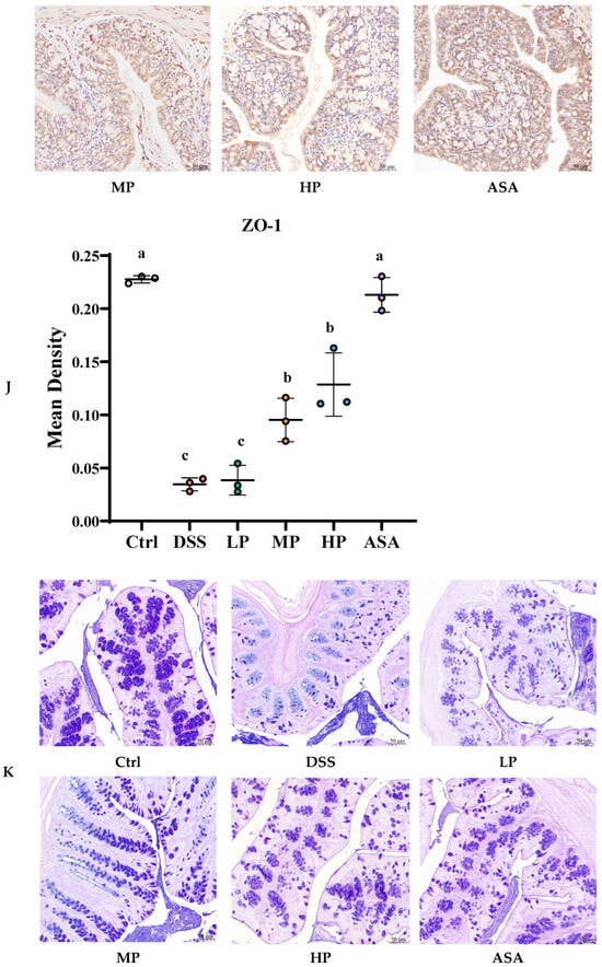A 1 cm2 piece of fresh distal colon was immersed in 4% neutral formaldehyde solution for 24 h. The tissue edges were then neatly trimmed, subjected to gradient dehydration in a dehydrator, and finally immersed in wax for embedding. The wax block was sliced into 4 μm sections, dewaxed in xylene, and rehydrated using a series of ethanol solutions. Colonic tissues were subjected to staining with hematoxylin and eosin (H&E) to evaluate colonic injury [14]. To identify goblet cells, Alcian blue periodic acid–Schiff (AB-PAS) staining was conducted employing the AB-PAS Stain Kit (Solarbio, Beijing, China), following the instructions provided by the manufacturer. The immunohistochemistry (IHC) procedure was carried out following the protocol established in [15].