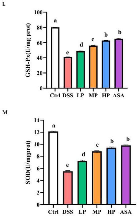 Relief effect of postbiotic Pa JY062 on 3% dextran sodium sulfate (DSS)-induced colonic barrier injury (n = 3). (A) Evans blue permeability. (B) Physical picture of Evans blue permeability. (C) Colon microstructure. (D) The mRNA expression of intestinal barrier proteins (Claudin-1, Occludin, ZO-1 and E-Cadherin). (E) Immunohistochemical images of Claudin-1. (F) Image J was used to quantify the immunohistochemical images of Claudin-1. (G) Immunohistochemical images of Occludin. (H) Image J was used to quantify the immunohistochemical images of Occludin. (I) Immunohistochemical images of ZO-1. (J) Image J was used to quantify the immunohistochemical images of ZO-1. (K) Representative AB-PAS pictures. (L) Glutathione peroxidase (GSH-Px). (M) Superoxide dismutase (SOD). The different letters indicate statistically significant differences (p < 0.05).