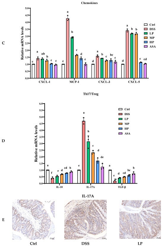 The transcript levels of chemokines demonstrated DSS-induced overexpression of CXCL-1 (1.42 ± 0.1 fold), MCP-1 (4.27 ± 0.19 fold), CXCL-3 (1.59 ± 0.08 fold), and CXCL-5 (3.41 ± 0.1 fold) versus Ctrl. Both ASA and Pa JY062 decreased chemokine hyperactivation (HP group reductions: CXCL-1 27%, MCP-1 67%, CXCL-3 19%, CXCL-5 67%; p < 0.01; Figure 6C).