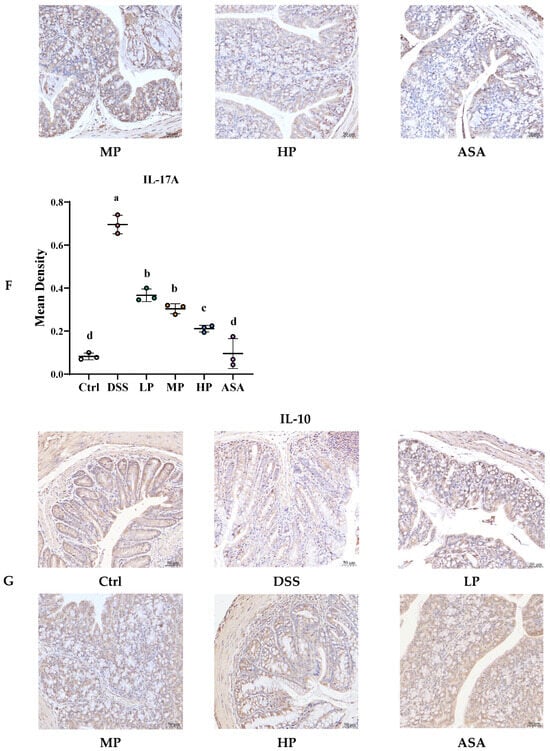 The DSS group exhibited Th17/Treg imbalance, marked by elevated IL-17A (4.7-fold vs. Ctrl) and suppressed IL-10 (0.4-fold) and TGF-β (0.2-fold). Pa JY062 restored cytokine equilibrium (HP group: IL-17A 0.4-fold, IL-10 1.9-fold, TGF-β 3.2-fold vs. DSS; p < 0.001; Figure 6D). IHC confirmed these findings, and the DSS group showed intense IL-17A immunostaining, whereas HP treatment reduced IL-17A positivity and enhanced IL-10 expression (Figure 6E–H).