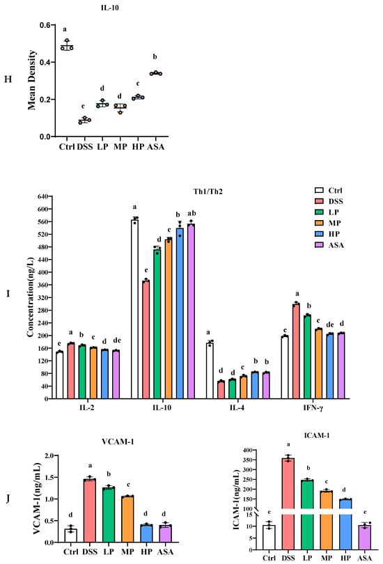 Colon tissue lysate was centrifuged at 3000× g for 5 min to harvest the supernatant for the assessment of cytokine (IL-2, IL-4, IL-10, IFN-γ) and cell surface adhesion molecules (VCAM-1, ICAM-1) concentrations, in accordance with the manufacturer’s instructions (Xinle, Shanghai, China).