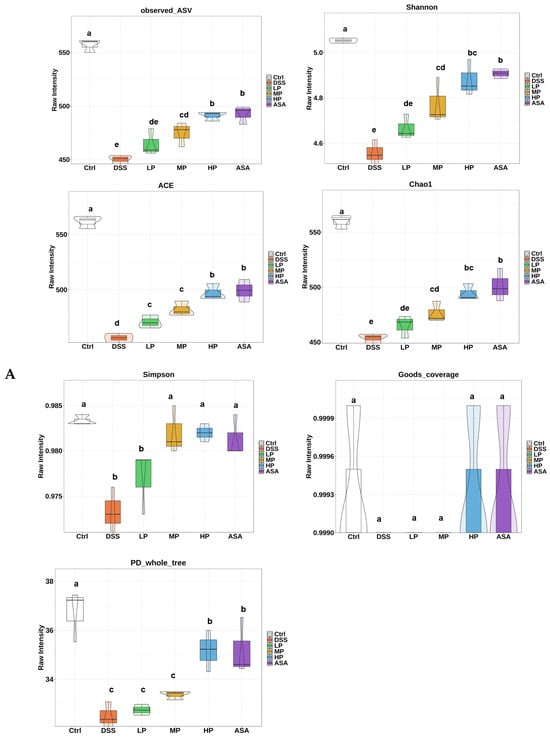To comprehensively assess the modulatory influence of Pa JY062 on UC in mice, we investigated the changes in gut microbiota and SCFAs. The alpha diversity analysis (Figure 7A) indicated that the DSS group displayed the lowest indices of species richness (Observed ASV, Shannon, Simpson, Chao1, ACE) compared to the Ctrl group. Pa JY062 treatment dose-dependently restored these indices, with the HP group showing the most pronounced restoration (p < 0.05). The phylogenetic diversity index (PD whole tree) followed a similar trend, while goods coverage remained consistent across groups, confirming adequate sequencing depth. Beta diversity analysis via principal component analysis (PCA) demonstrated distinct clustering between the DSS and Ctrl groups. In contrast, the LP, MP, HP, and ASA groups exhibited closer proximity to the Ctrl group, with intra-group homogeneity, indicating Pa JY062 effectively mitigated DSS-induced beta diversity disruption (Figure 7B).