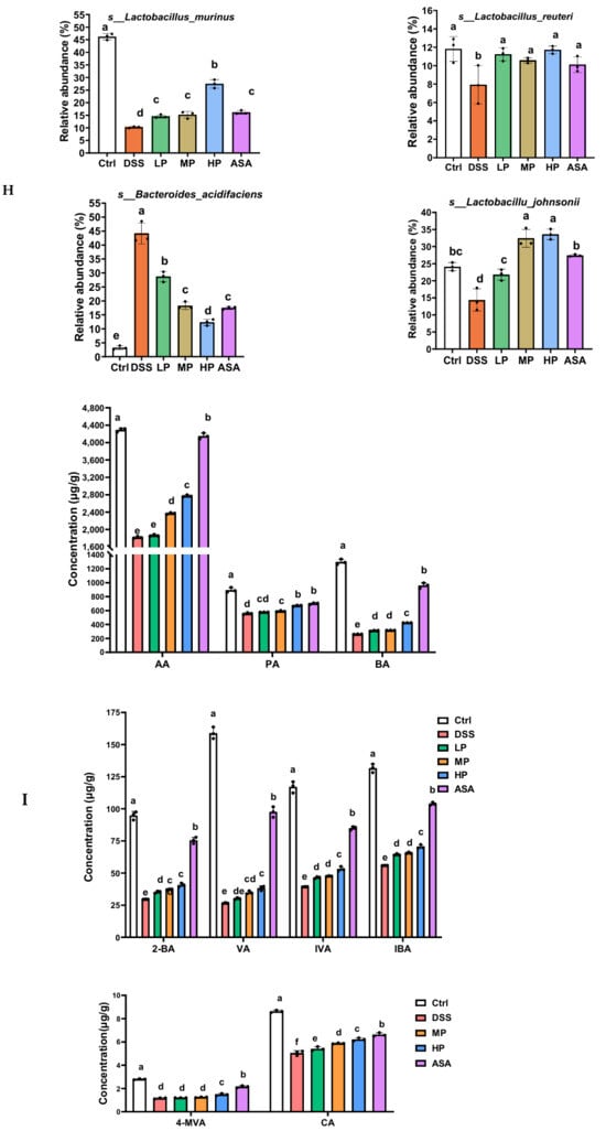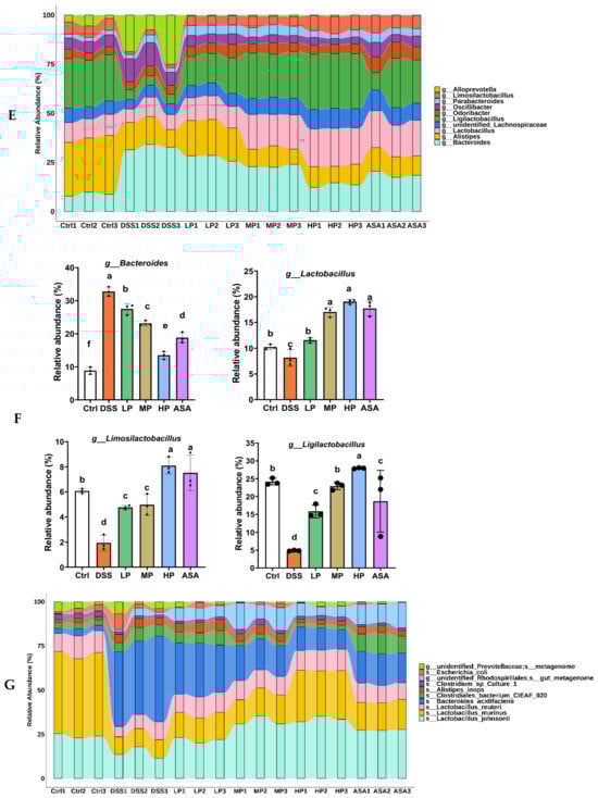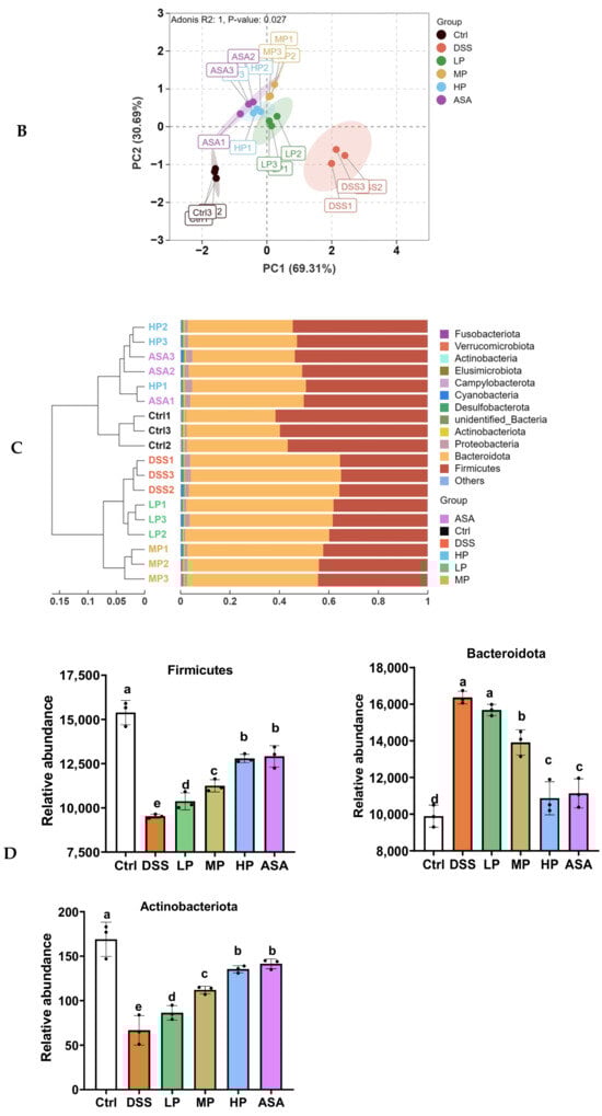 At the phylum level, DSS treatment significantly altered the microbial composition, notably increasing the relative abundance of Bacteroidota and decreasing that of Firmicutes and Actinobacteriota compared to the Ctrl group (p < 0.01; Figure 7C,D). These alterations were reversed in the HP group, achieving a profile comparable to the ASA group (Figure 7C,D).