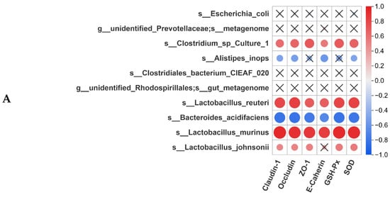 To elucidate the interplay among gut microbiota, intestinal barrier function, inflammatory factors, and SCFAs, Spearman correlation analysis was performed on 10 key microbial species, intestinal barrier proteins (Claudin-1, Occludin, ZO-1, E-Cadherin), antioxidant enzymes (GSH-Px, SOD), inflammatory factors, and SCFA levels. Claudin-1, Occludin, ZO-1, E-Cadherin, GSH-Px, and SOD exhibited strong positive correlations with L. murinus (r = 0.93–0.97, p < 0.01) and L. reuteri (r = 0.73–0.88, p < 0.01). These markers showed significant negative correlations with B. acidifaciens (r = −0.87 to −0.69, p < 0.01) (Figure 8A).
