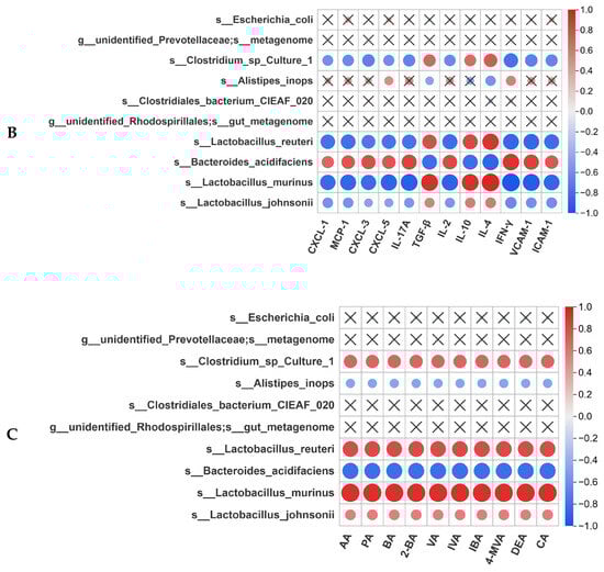 Spearman correlation analysis between species-level abundance and short-chain fatty acids, intestinal barrier proteins, and inflammatory factors.(A) Correlation between key gut barrier markers and gut microbiota. (B) Correlation between intestinal inflammation markers and gut microbiota. (C) Correlation between short-chain fatty acids (SCFA) and gut microbiota. In the panels, the ‘X’ symbol indicates no significant association; red and blue circles denote positive and negative correlations, respectively; the size of the circle represents the strength of the correlation.