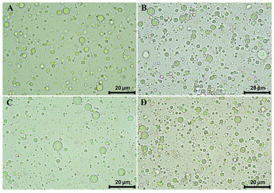 As depicted in Figure 1, ME-C, ME-CGA, ME-CU, and ME-CGA/CU exhibited the typical multi-compartment structure of MEs, with oil droplets containing smaller internal water droplets. Regarding oil droplet size, expressed as D4,3 values (Table 1), all MEs presented values of approximately 2 µm and displayed a monomodal size distribution (Figure S2A), indicating that the incorporation of bioactive compounds did not affect droplet size.