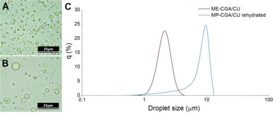 The microstructure of the recovered ME-CGA/CU, obtained by rehydrating MP-CGA/CU, was assessed as described in Section 2.3.3. Based on Equation (5), droplet size and distribution were obtained from five images at 40× magnification, using measurements of 300 droplets processed with Levenhuk ToupView software (v4.11.19728.20211022, Hangzhou, China).
