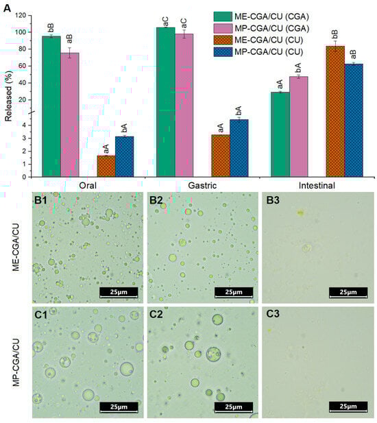 In vitro gastrointestinal digestion of ME-CGA/CU and MP-CGA/CU was performed, reproducing human oral, gastric, and intestinal stages. The simulation of the process and preparation of the corresponding digestive fluids were carried out according to the INFOGEST protocol []. The oral, gastric, and intestinal phases were conducted at pH 7.0 for 2 min, pH 2.0 for 2 h, and pH 7.0 for 2 h, respectively. All stages were performed at 37 °C under continuous shaking. The amounts of CGA and CU released after each stage of digestion were quantified by UPLC as detailed in Section 2.3.2. To determine the bioaccesible fraction of CGA and CU, the aqueous phase containing the micellar fraction was collected after the intestinal stage by centrifuging the digested samples at 9056× g for 60 min at 4 °C.