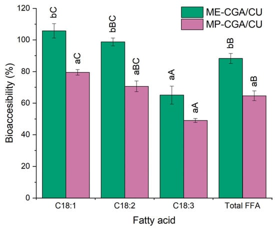 The fatty acids released during digestion were extracted from the micellar phase, methylated into fatty acid methyl esters, and subsequently identified and quantified by gas chromatography (7890B, Agilent Technologies, Santa Clara, CA, USA) []. Quantification of oleic (C18:1), linoleic (C18:2), and α-linolenic (C18:3) acid methyl esters was based on calibration curves (R2 = 0.99).