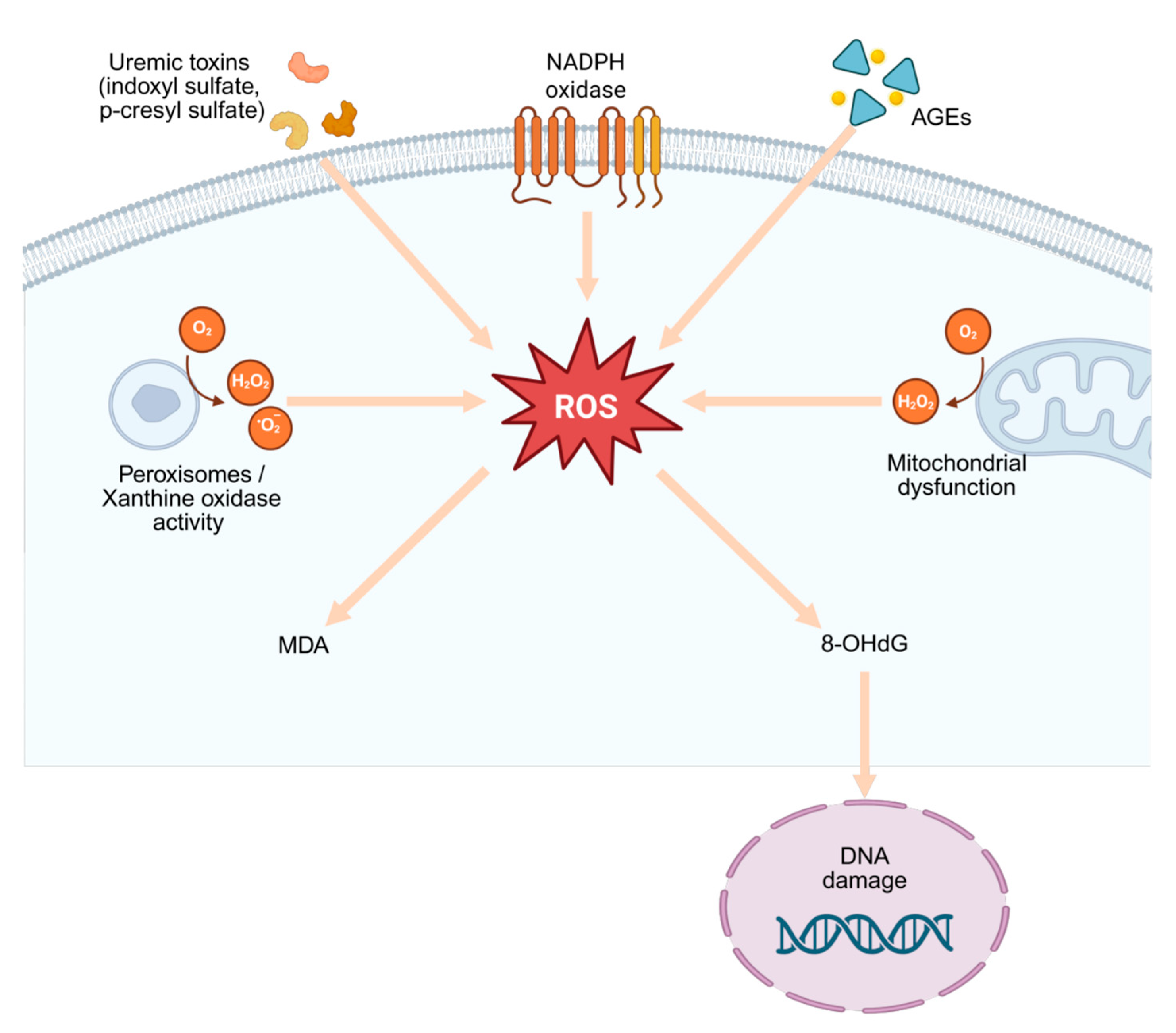 ROS sources in CKD | Mitochondrial dysfunction, NOX4/NOX5, xanthine oxidase, myeloperoxidase, uncoupled eNOS; amplified under uremic conditions. | [11] |