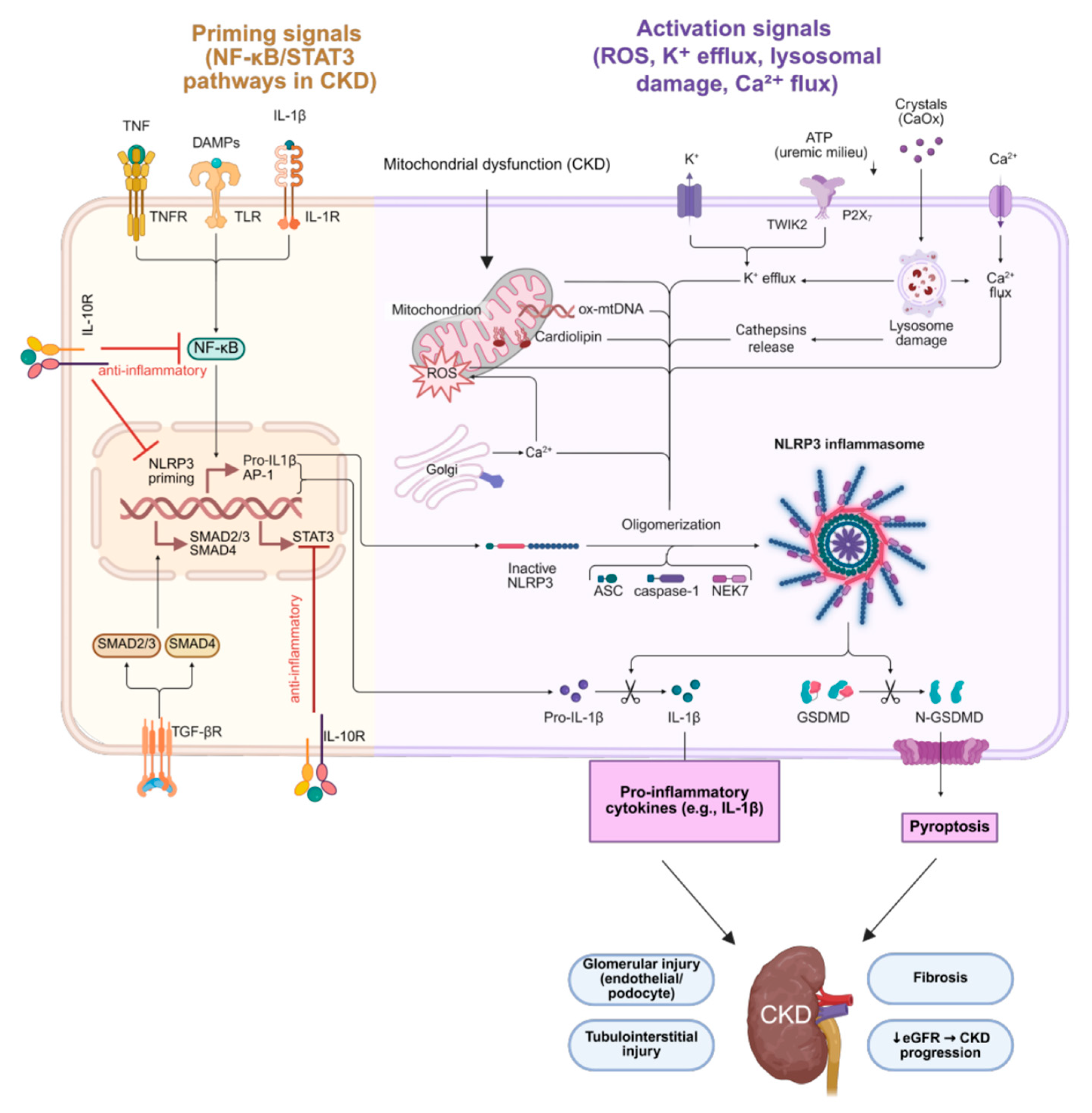 NLRP3 inflammasome | Activated in renal myeloid cells → ↑ IL-1β → amplifies inflammation and accelerates atherosclerosis. | [30] |