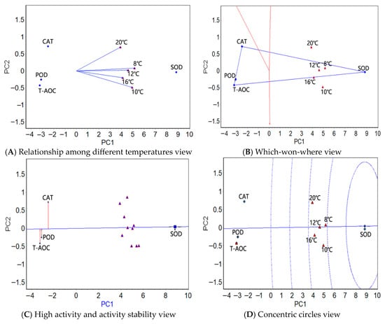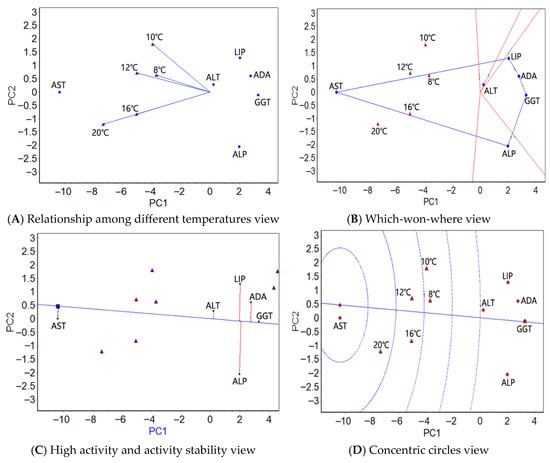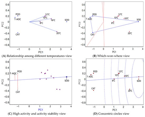 The mean activities of the four antioxidants/six serum enzymes at five temperatures were used in a GGE biplot analysis (Supplementary Materials Section SA: Tables S1–S3). The “relationship among different temperatures” view (panel A in Figure 1, Figure 2 and Figure 3), the “which-won-where” view (panel B in Figure 1, Figure 2 and Figure 3), the “high activity and activity stability” view (panel C in Figure 1, Figure 2 and Figure 3), and the “concentric circles” view (panel D in Figure 1, Figure 2 and Figure 3) were drawn using the GGE biplot analysis results (Supplementary Materials Section SA: Tables S4–S6); see Supplementary Materials Section SB for a detailed explanation of the GGE biplot views.