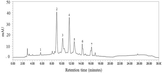 Fingerprint chromatogram of “MP1”. The labelled peaks are gallic acid (peak 1), cyanidin-3-glucoside (peak 2), pelargonidin-3-glucoside (peak 3), cyanidin 3-O-(6”-malonyl-glucoside) (peak 4), cyanidin-3-o-β-glucopyranoside (peak 5), ferulic acid (peak 6) and rutin (peak 7).