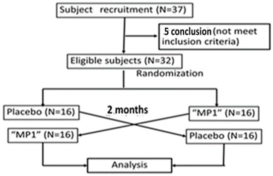 This study was designed as a one-center, randomized, double-blind, placebo-controlled crossover study and 2 × 2 trial with an allocation ratio of 1:1, as shown in Figure 2. The subjects were recruited at the Menopause Clinic, Faculty of Medicine, Khon Kaen University, by the staff of the clinic and Ms. Kirisattayakul, W. After being given an interview and a physical examination by the physician for the project, and providing a written consent form, the subjects were randomly allocated to either the placebo or the MP1-treated group (N = 16/arm). All subjects were requested to consume 160 mL of the assigned substances (both the placebo and the functional drink provided a total energy level of 3.85 kilocalories per serving) within 10 min once daily 30 min before breakfast for 2 months. The primary outcome of the study was event-related potential (ERP). The parameters included the alterations in both latency and amplitude of P300 and N100. The secondary outcomes consisted of working memory, serum oxidative stress, serum total phenolic compound level and the activities of both acetylcholinesterase (AChE) and monoamine oxidase (MAO). The consumption safety was also monitored by using hematological changes and blood chemistry profiles as parameters. All parameters were measured at baseline or prior to the intervention, and every month until the end of the 2-month study period. After a 2-week washout period (the half-life of anthocyanins is around 132.6 min [28], so 2 weeks were enough to eliminate the carrying effect), the second session was initiated and the placebo-treated group had to consume “MP1”, whereas the “MP1”-treated group had to consume the placebo. At 1 month after the cessation of the second session, assessments of ERP and working memory were also performed. During the study period, all participants were requested not to consume other functional foods or beverages, and maintained their normal lifestyles. Compliance was monitored by counting the bottles of the functional drink between each visit. To decrease confounding errors, physical activity and food consumption were monitored by using the questionnaires provided in the Supplementary Files S1 and S2.