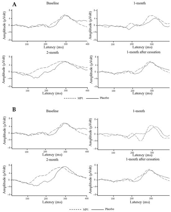 The effects of MP1 on ERP components were assessed after one and two months of intervention, as well as at one month after the cessation of treatment; the results are presented in Table 4 and Figure 3. Interestingly, the “MP1”-treated group exhibited significant reductions in N100 and P300 latencies at the Fz location (p < 0.01 and p < 0.001, respectively, compared to the placebo group) after one month of treatment. A significant reduction in P300 latency was also observed at the Cz location (p < 0.001 compared to the placebo group). When the treatment was extended to 2 months, it was found that the reduction in P300 latency observed at the Fz location was still present (p < 0.001 compared to the placebo group). At this period, reductions in latency of both the N100 and P300 brain wave components in the “MP1”-treated group were also observed at the Cz location (p < 0.05 and p < 0.001, respectively, compared to the placebo group). All changes mentioned earlier were not observed 1 month after treatment cessation, as shown in Table 2 and Figure 3A,B.