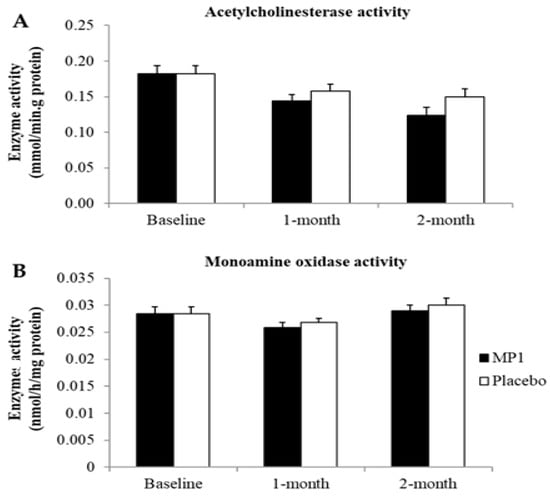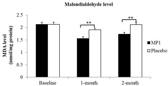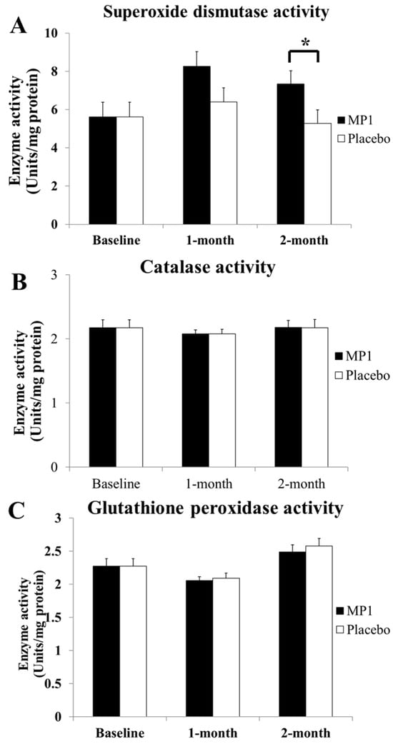 Table 7 shows the effect of “MP1” on hematological changes. No significant differences in hematological parameters were observed between the MP1 and placebo groups after one or two months of consumption. Furthermore, no significant changes from baseline were detected in any parameter throughout the study period.