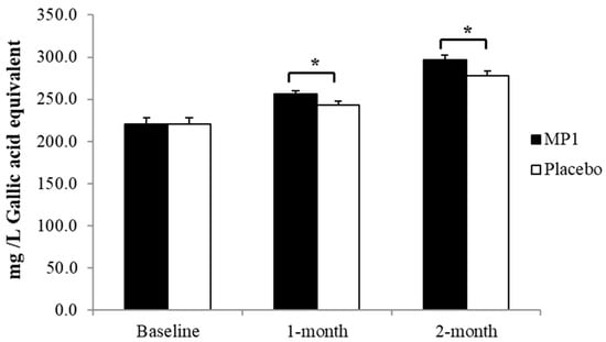 The total phenolic compound content was determined by using the Folin–Ciocalteau method [24]. Briefly, 20 µL of plasma was mixed with 1.58 mL of distilled water and 0.1 mL of 50% (v/v) Folin–Ciocalteu phenol reagent (Sigma-Aldrich, St-Louis, MO, USA). After exposure to an 8 min incubation period, 0.3 mL of 20% sodium carbonate was added and mixed well. The mixture was incubated at room temperature for 2 h and the absorbance was measured at 765 nm with a UV-spectrophotometer (Pharmacia LKB-Biochrom4060, Pharmacia LKB Biochrom Ltd., Cambridge, UK). Gallic acid was used as the standard calibration curve with a concentration range from 50 to 600 mg/L. Data were expressed as mg/L gallic acid equivalent.
