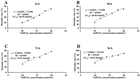 (A–D) The mortality rates of M. rosenbergii at different concentrations of NaHCO3 at 24 h, 48 h, 72 h, and 96 h, respectively.