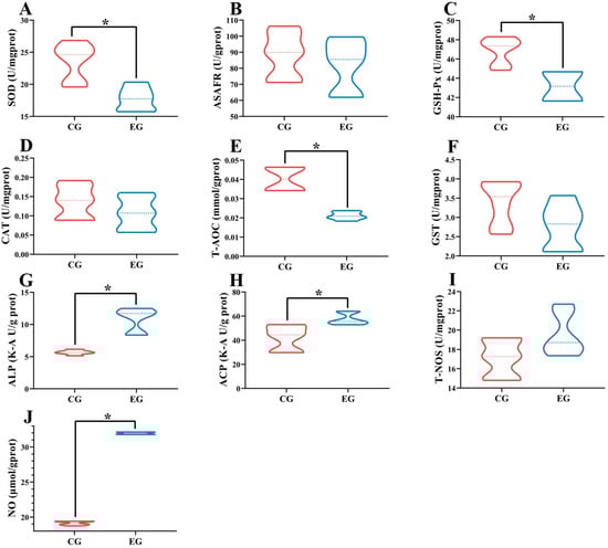 All antioxidant (superoxide dismutase (SOD), anti-superoxide anion free radical (ASAFR), glutathione peroxidase (GSH-Px), catalase (CAT), total antioxidant capacity (T-AOC), glutathione s-transferase (GST)), and immune indices (alkaline phosphatase (ALP), acid phosphatase (ACP), nitric oxide synthase (T-NOS), and nitric oxide (NO)) were measured using commercial assay kits (Nanjing Jiancheng Bioengineering Institute, Nanjing, China) according to the manufacturer’s protocols. Enzyme activities were quantified using specified instruments as per the kit instructions.