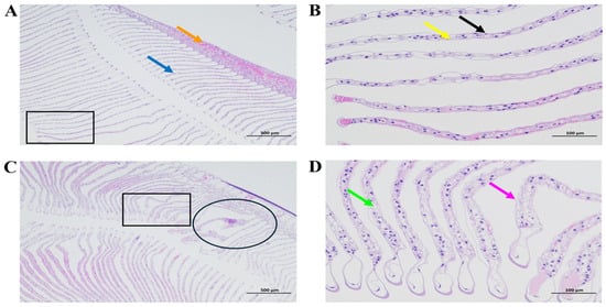 The analysis of gill tissues in M. rosenbergii (H&E staining): (A,B) the control group showing intact tissue architecture; (C,D) the NaHCO3-exposed group caused tissue damage. Magnification: (A,C) 40×; (B,D) 200×.