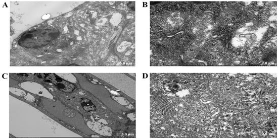 As shown in Figure 4, compared to the control group, the gill cells of M. rosenbergii in the NaHCO3-exposed group exhibited severe edema and disintegration, with extensive dissolution of cell membranes. The nuclei (N) appeared irregularly shaped, accompanied by incomplete cell membranes and dissolution of the cytoplasmic matrix. Mitochondria (M) displayed marked swelling and disintegration, characterized by membrane rupture and extensive dissolution/loss of cristae.