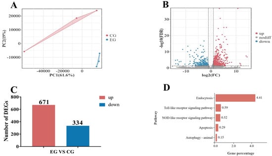 To ensure data quality, raw reads were subjected to preprocessing to eliminate interference from low-quality or irrelevant data prior to bioinformatic analysis. First, raw sequencing data were processed using fastp for quality control [18]. Low-quality reads were filtered based on the following criteria: (1) removal of reads containing adapter sequences; (2) exclusion of reads composed entirely of poly A sequences; (3) discarding reads with low-quality bases (Q ≤ 20) constituting > 50% of the read length. The resulting clean reads were subsequently aligned to a species-specific ribosomal RNA (rRNA) database to remove residual rRNA-derived sequences [19]. Unmapped reads were retained for transcriptomic analysis. Finally, for reference genome-based alignment, HISAT2 was employed to map clean reads to the reference genome. After StringTie-based transcript assembly, RSEM [20] was employed to quantify gene expression levels. Differential gene expression analysis was performed using DESeq2 [21], with significance thresholds defined as a false discovery rate (FDR) < 0.05 and |log2(fold change)| > log2(2). Genes meeting these criteria were identified as significantly differentially expressed.