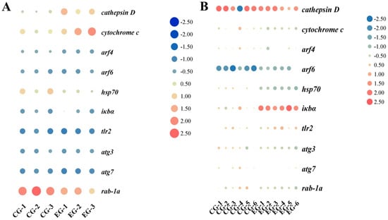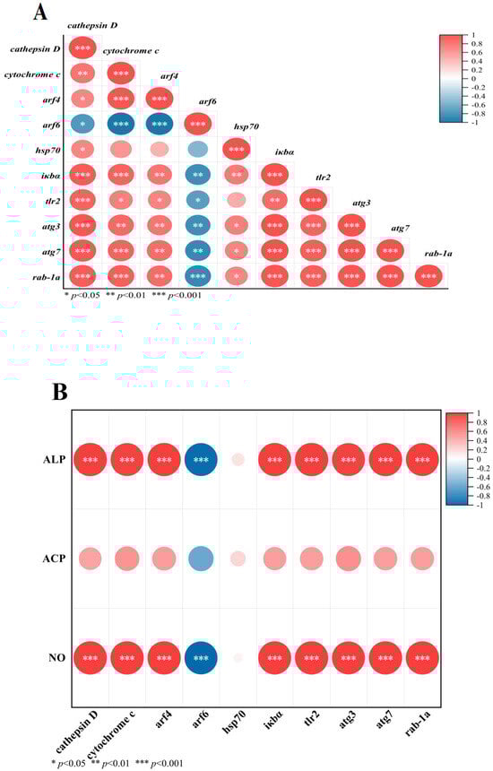 The correlation analysis between DEGs and among DEGs, as well as between DEGs and immune-related enzymes, is shown in (A) and (B), respectively. Cathepsin D, cytochrome c, ADP-ribosylation factor 4 (arf4), ADP-ribosylation factor 6 (arf6), heat shock protein 70 (hsp70), NF-kappa B inhibitor alpha (iκbα), toll-like receptor 2 (tlr2), autophagy 3 (atg3), autophagy 7 (atg7), ras-related protein Rab-1A (rab-1a). Alkaline phosphatase (ALP), acid phosphatase (ACP), nitric oxide (NO).