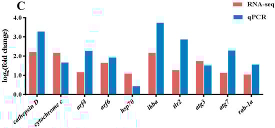 The visualization heat maps of samples and DEGs in the RNA-seq and qPCR results are shown in Figure 6A,B, respectively. The transcriptome results showed that cathepsin D, cytochrome c, ADP-ribosylation factor 4 (arf4), ADP-ribosylation factor 6 (arf6), heat shock protein 70 (hsp70), NF-kappa B inhibitor alpha (iκbα), toll-like receptor 2 (tlr2), autophagy 3 (atg3), autophagy 7 (atg7), and ras-related protein Rab-1A (rab-1a) were significantly upregulated in the NaHCO3-exposed group compared with the control group. The qPCR results were consistent with the RNA-seq results, confirming the reliability of the RNA-seq results, which could be used for the subsequent analysis (Figure 6C).